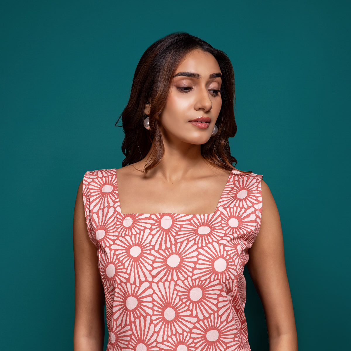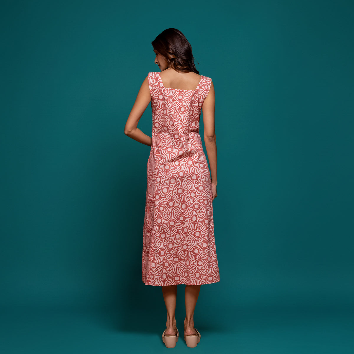 Bask in the warmth of effortless elegance with our Aura Printed Midi Dress. Crafted from 100% breathable cotton, this sleeveless dress features a radiant sunburst print that captures the joy of sunlight in motion. The flattering square neckline, gently flared hem, and a touch of ease through the silhouette make it a timeless piece for every season.