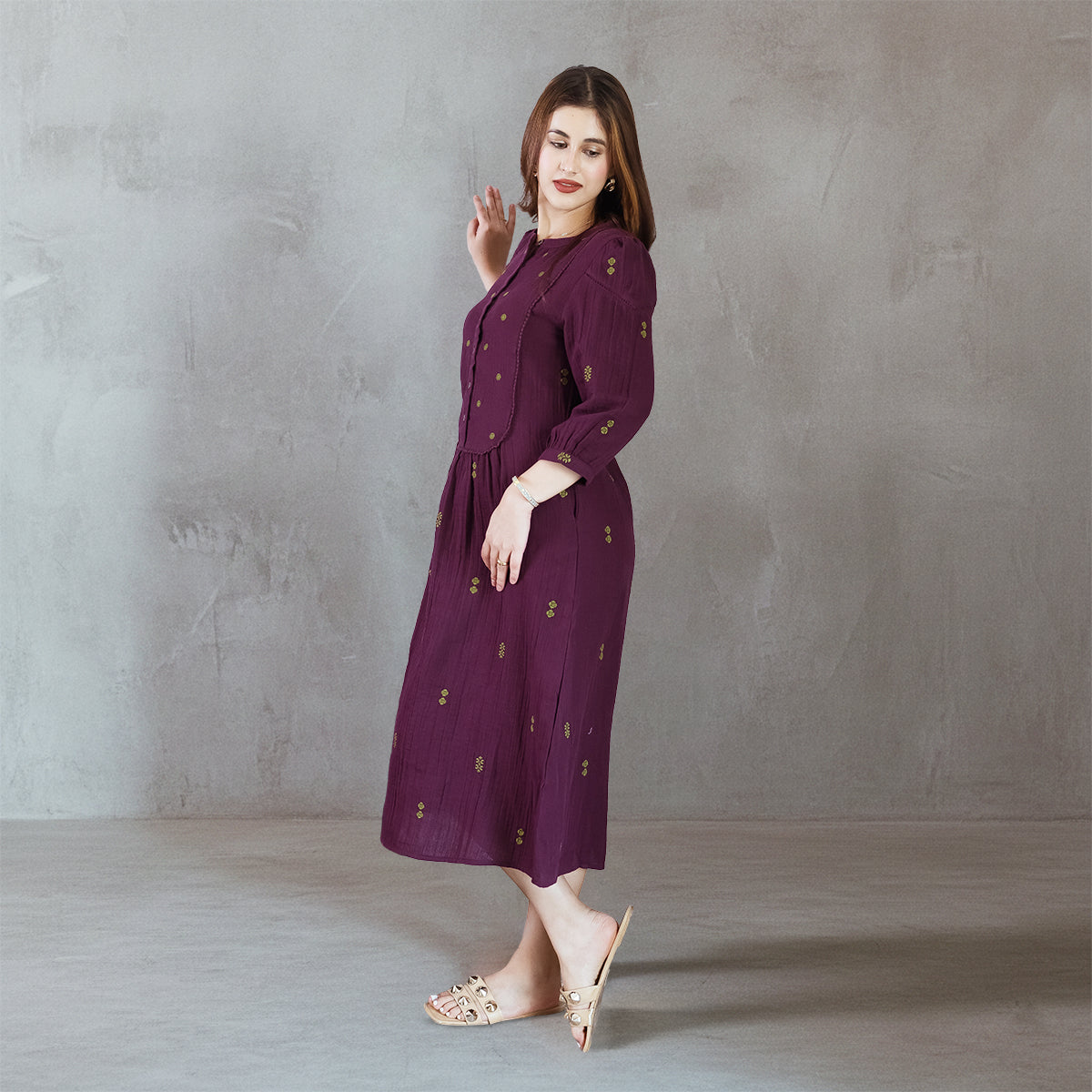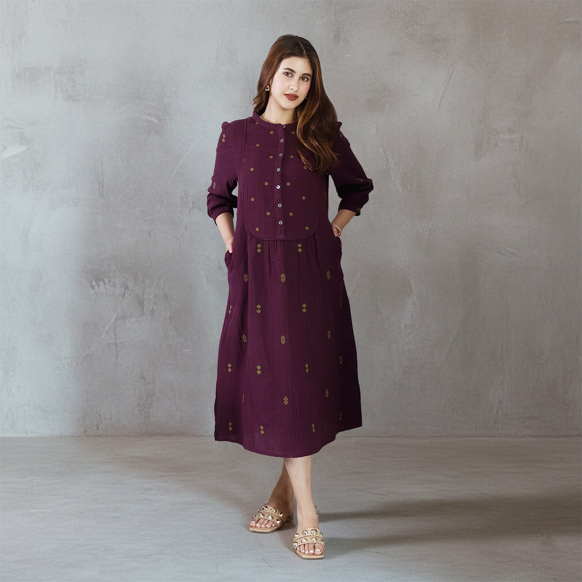 Our Wine Embroidered Dress is super light, breathable and gives you all the perfect summery vibes that you're looking for. It is made from double cloth soft cotton, giving it a beautiful textured finish.