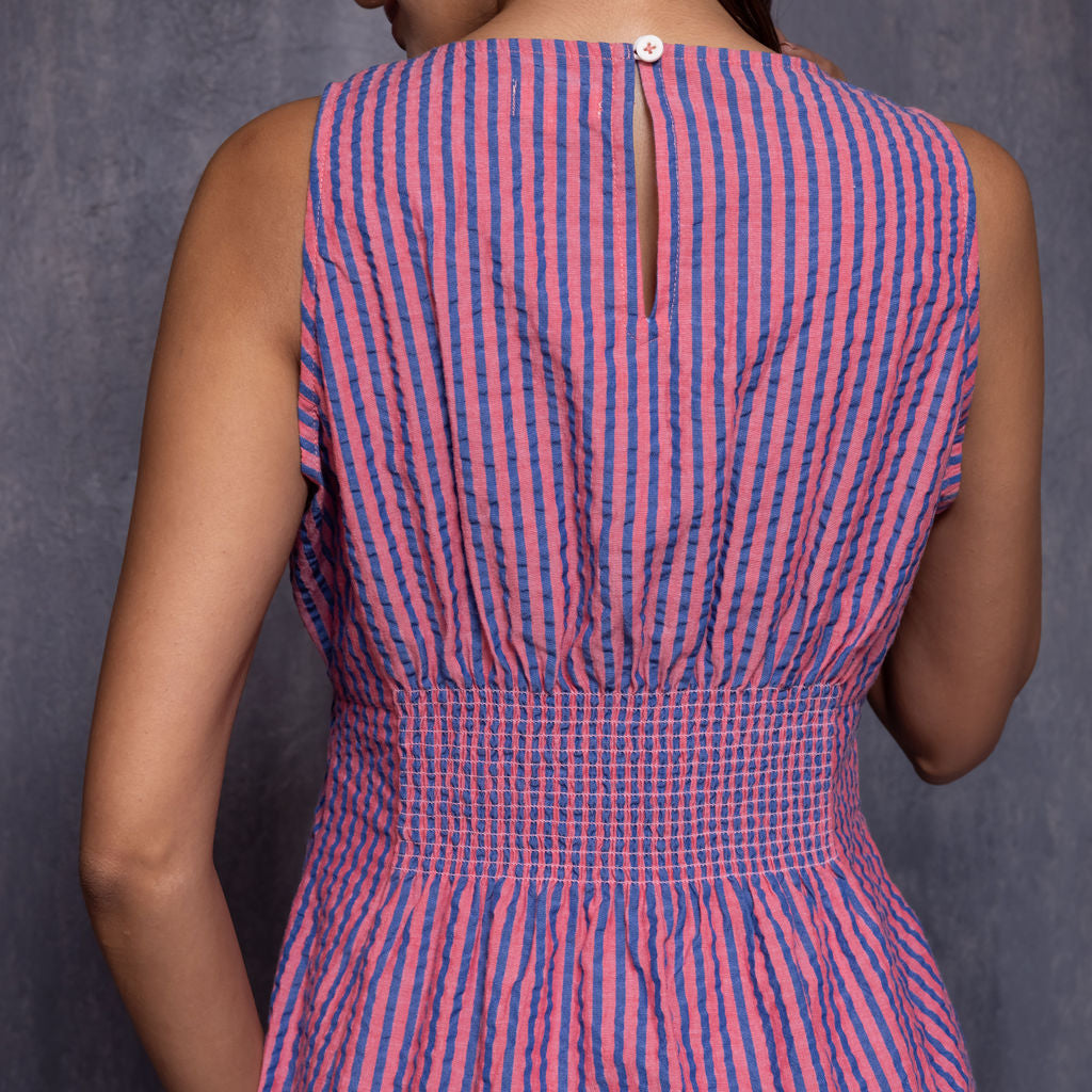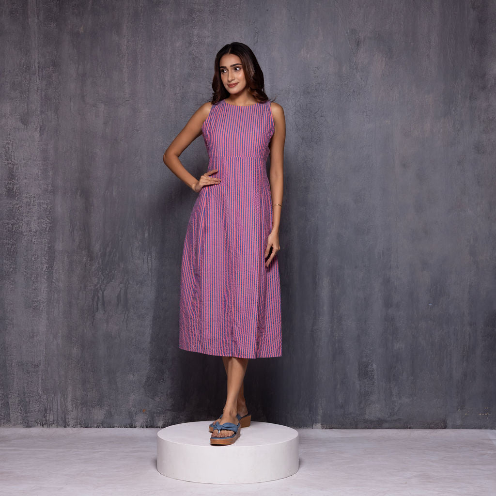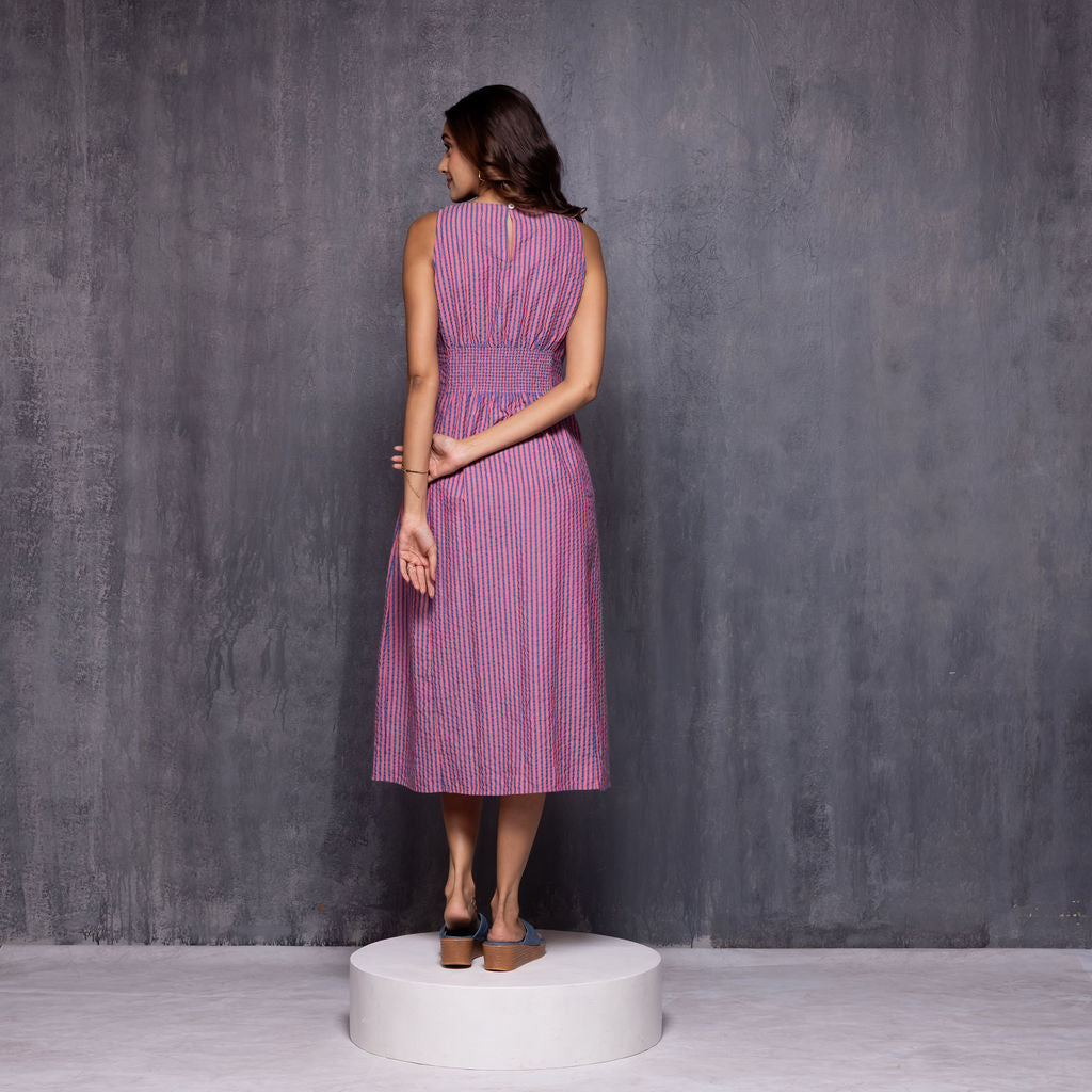A blend of texture and ease, this 100% cotton seersucker midi dress embodies effortless charm in soothing mauve pink and blue stripes. Soft smocking along the shoulders and back flatters the form while ensuring comfort. Finished with side pockets and a gentle side slit, it moves with you. Perfect for days that call for relaxed elegance and easy grace.