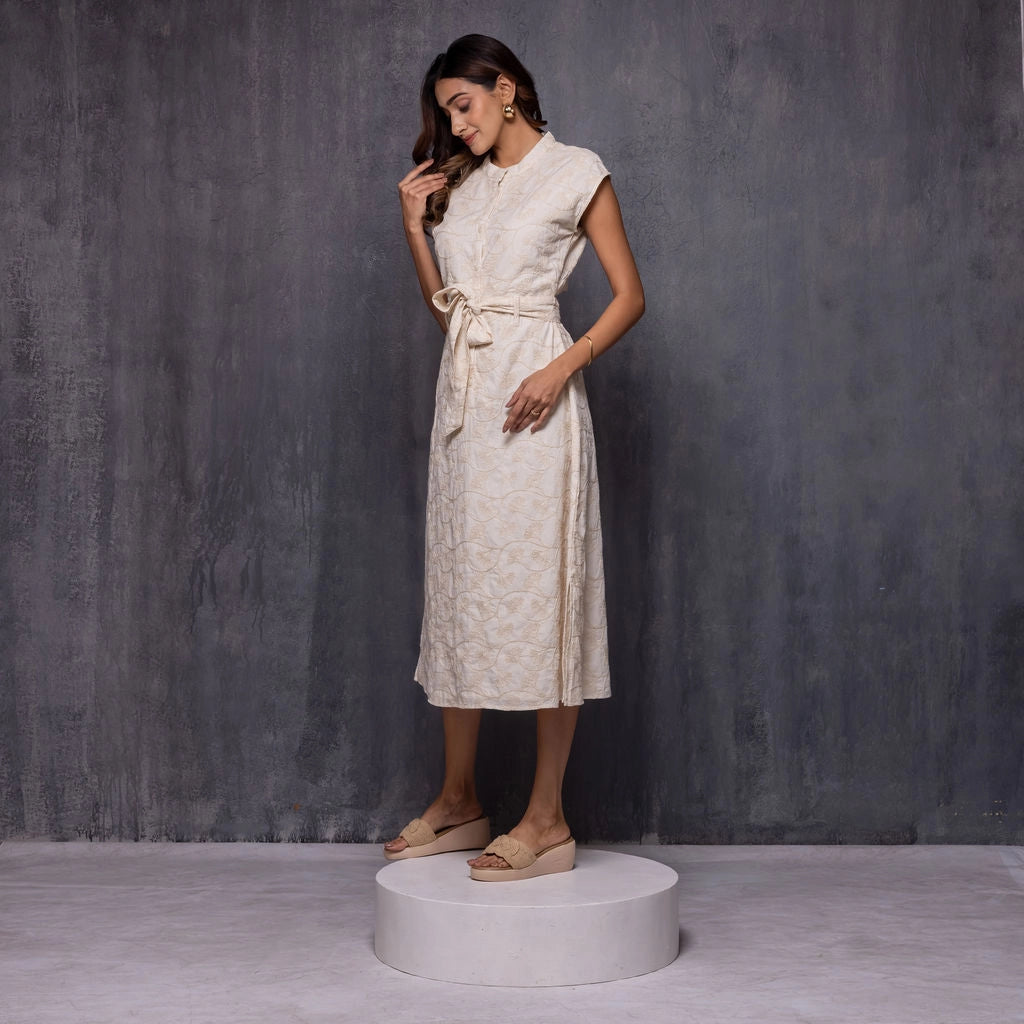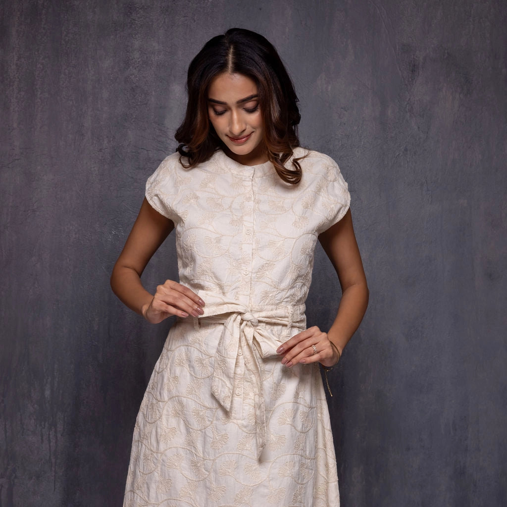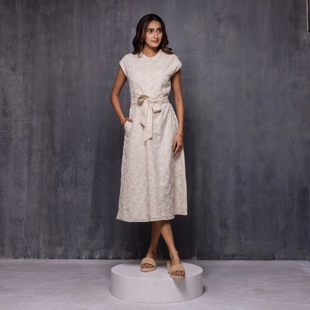 Crafted in beautifully detailed ginkgo flower embroidered fabric, this midi dress blends artisanal texture with an elegant, contemporary silhouette. The front features a clean mandarin collar, cap sleeves, and a neatly structured bodice, finished with a soft waist tie that enhances the shape. The back is designed to create the illusion of a coordinated crop top and skirt, offering a modern twist while maintaining complete comfort and coverage. The skirt is gently fitted with soft elastic at the back, ensuring ease of movement and a flattering fit through the waist.
