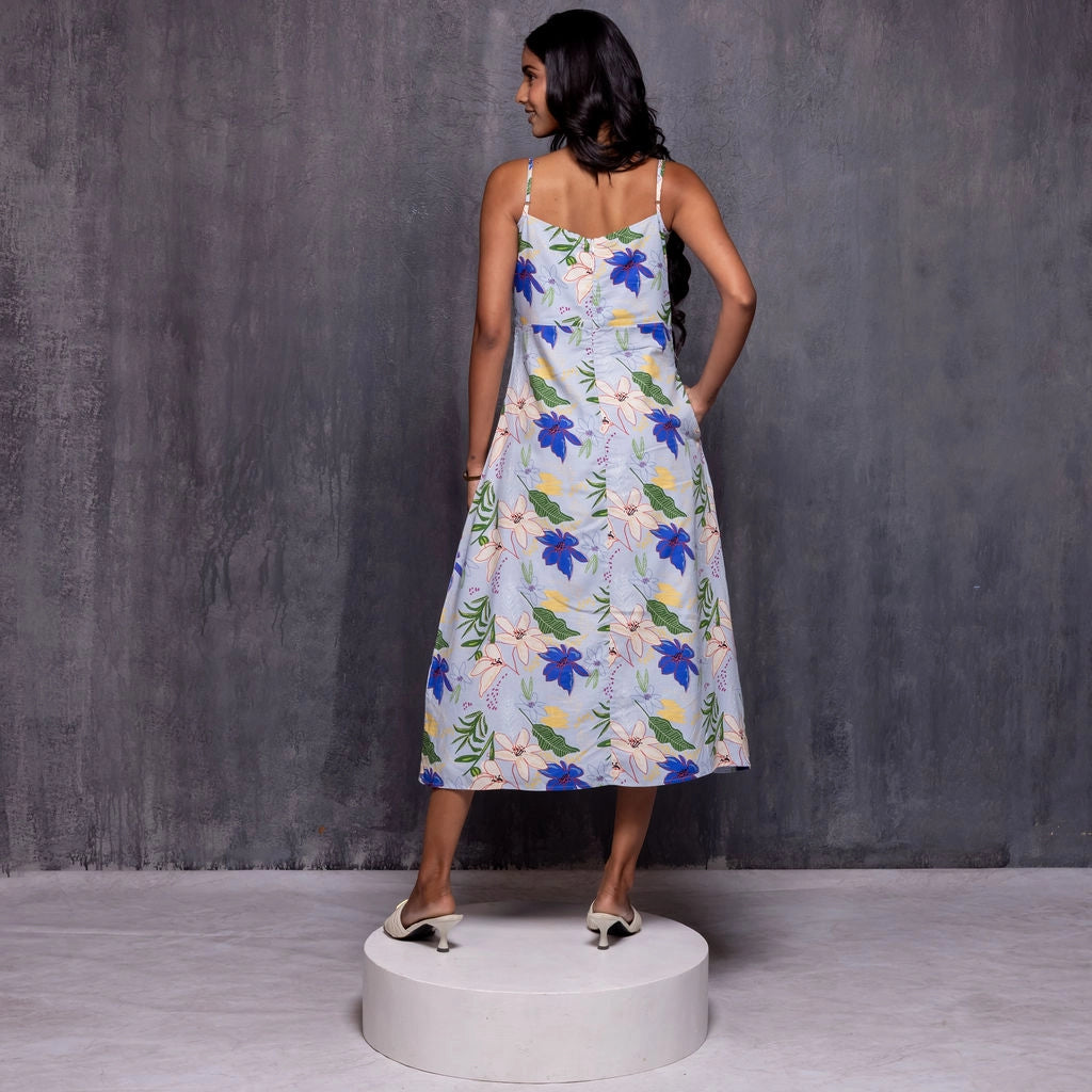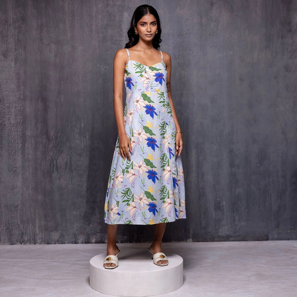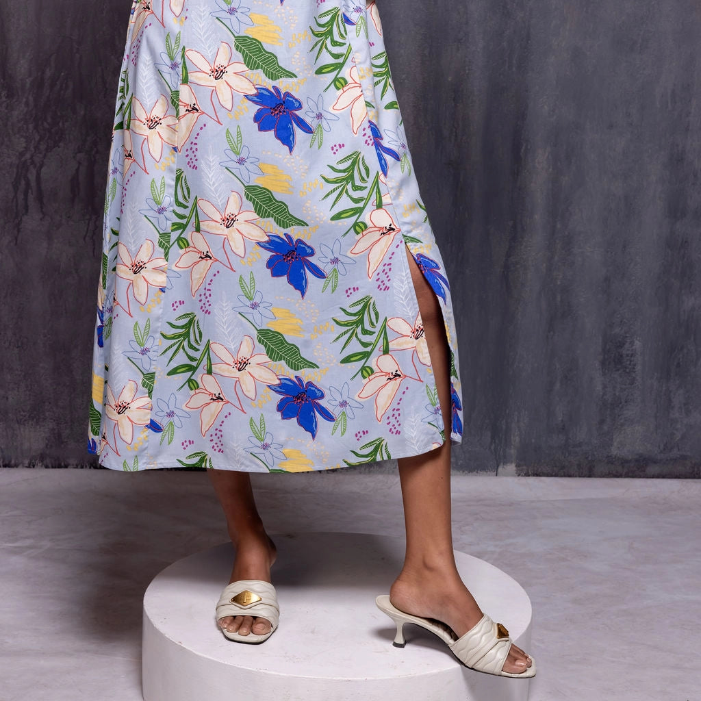 This cotton midi dress brings ease, lightness and colour together in the softest way. Designed in a breezy A-line silhouette, it skims effortlessly without clinging, letting the print take center stage. The floral artwork feels fresh and joyful, making it a piece you reach for on slow mornings, sunny days and everything in between. Made with premium cotton that holds its shape beautifully, it feels like comfort you can wear.