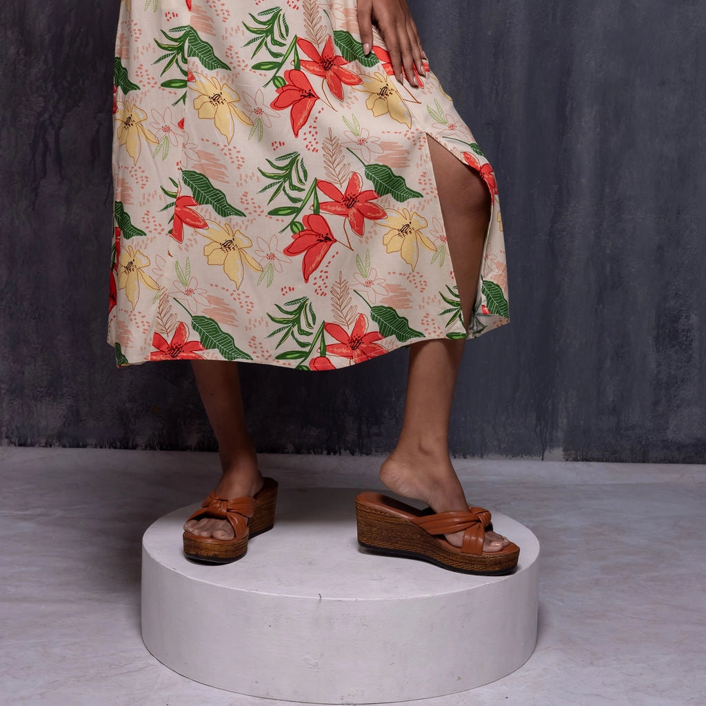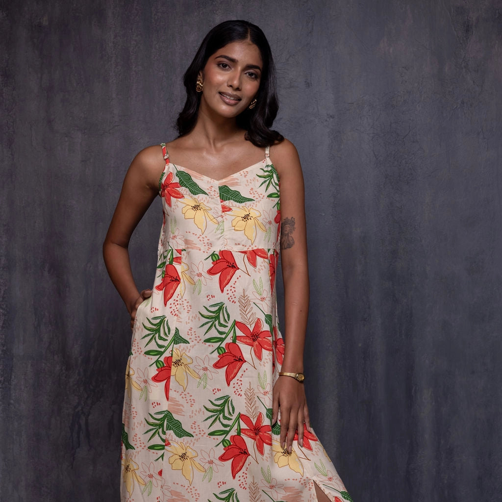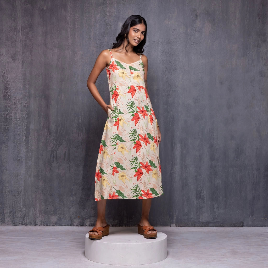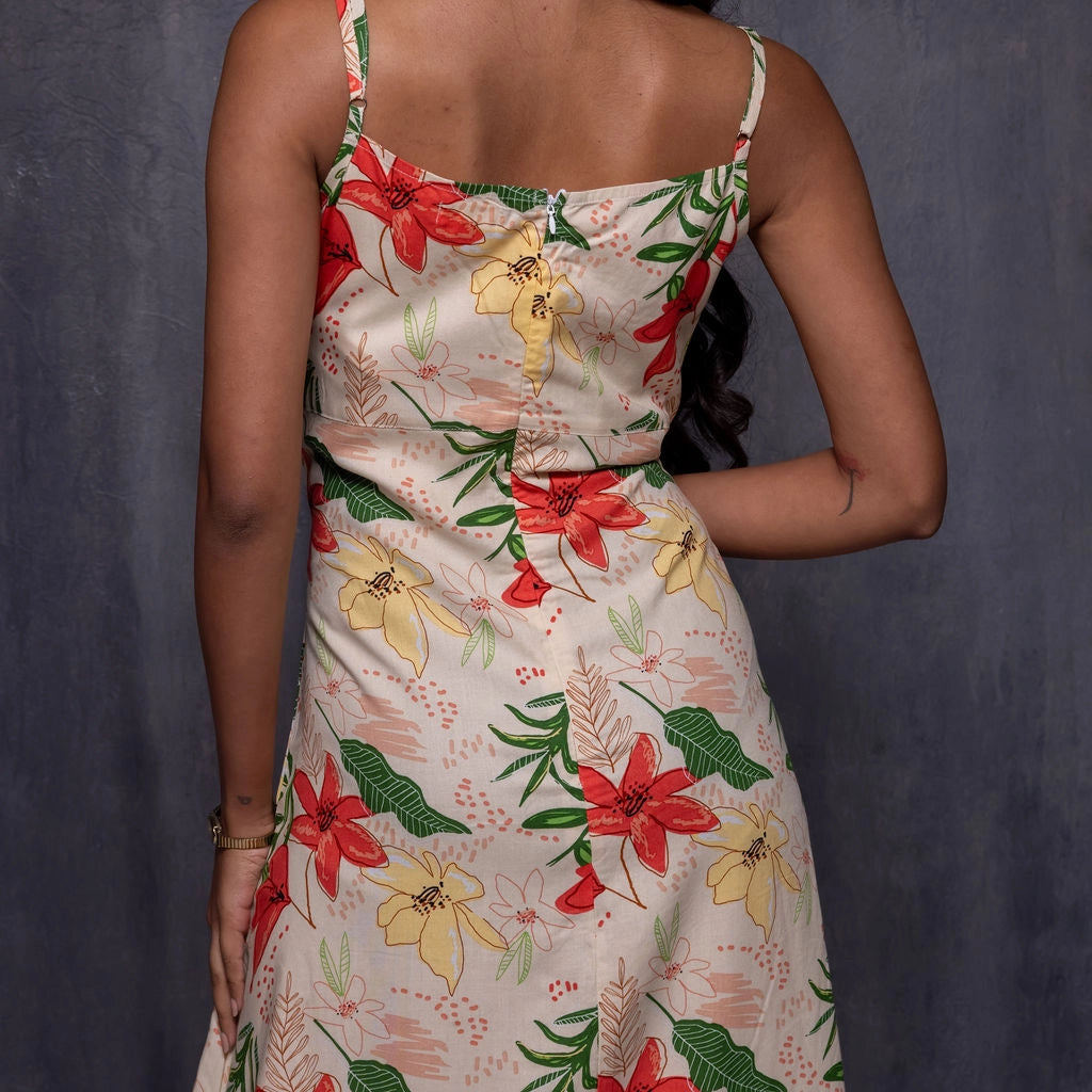 This cotton midi dress brings ease, lightness and colour together in the softest way. Designed in a breezy A-line silhouette, it skims effortlessly without clinging, letting the print take center stage. The floral artwork feels fresh and joyful, making it a piece you reach for on slow mornings, sunny days and everything in between. Made with premium cotton that holds its shape beautifully, it feels like comfort you can wear.