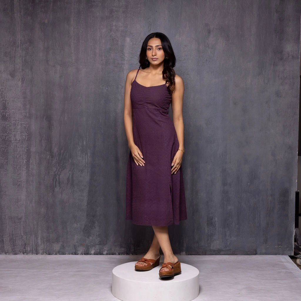 A 100% cotton Schiffli midi dress with delicate butterfly embroidery, soft cotton lining, and a relaxed feminine fit — perfect for effortless days out. The dress features a soft cotton lining for all-day comfort, dainty spaghetti straps, a gently ruched bust, and a graceful A-line fall that flatters every shape. A side slit adds ease of movement and an effortless charm. Perfect for brunches, holidays, or weekend getaways.